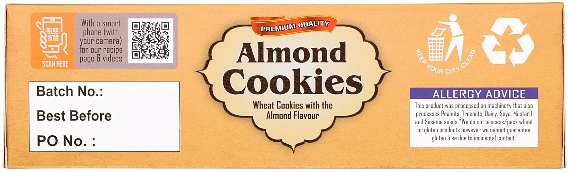 Ingredients: Wheat flour, Sugar, Palm Oil, Almond, Skimmed Milk Powder, Coconut Powder, Salt, Raising Agents (Sodium Bicarbonate, Ammonium Bicarbonate). Added Artificial Flavour (Almond)