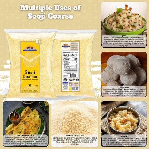 Product Type: FlourPackaging: Plastic Bag Product of India Ingredients: Farina (Semolina) Coarse Grind You'll LOVE our Sooji Coarse (Farina, Suj...