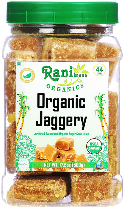 Rani Organic Jaggery (Unrefined Evaporated Organic Sugar Cane Juice) 17.5oz (1.1lbs) 500g PET Jar ~ Gluten Friendly | Vegan | NON-GMO | No Salt or fillers | Indian Product | USDA Certified Organic