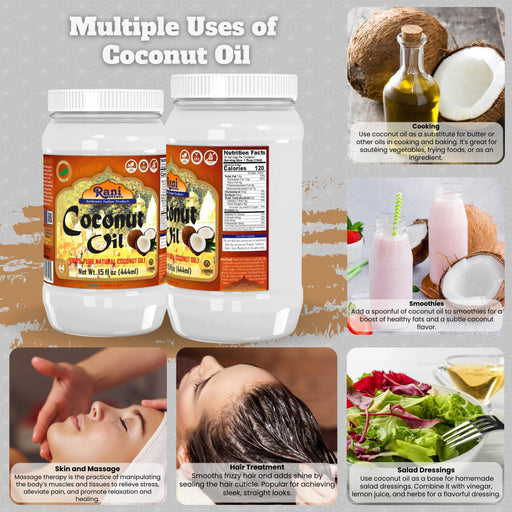 Rani's Coconut Oil is made from the fresh flesh of the coconut palm fruit (Cocus nucifera) This specific process does not utilize any solvents and ...
