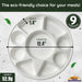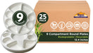 • 🍽️REDUCED PLATE CLUTTER: Made to have 9 round compartments to eliminate the need for multiple dishes or bowls to serve various foods, which can help reduce plate clutter and make mealtime more manageable. It can also hold your cups which is very convenient!🍽️DIMENSION: A pack of 25 white round biodegradable plates. Each plate has a diameter of 31.6cm (12.44") and thickness of 3.5cm (1.38").