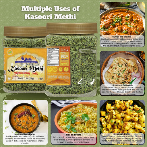 Product Type: Dried LeavesPackaging: Plastic JarNet Wt. 3.5oz (100g)Product of India Ingredients: Dried fenugreek leaves You'll LOVE our Dri...