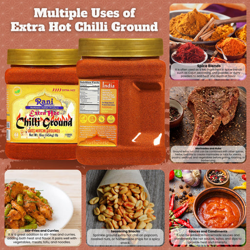 Product Type: Chilli PowderPackaging: Plastic JarNet Wt. 16oz (1lb) 454g Product of India Ingredients: Extra Hot Ground Chilli Powder Yo...