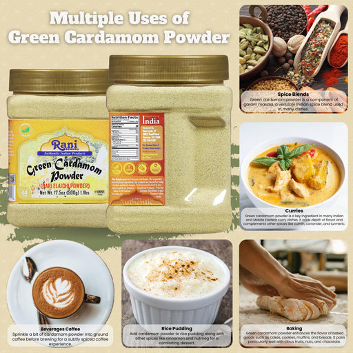 Product type : Powder Packaging : Plastic Jar Net Wt. : 17.5oz (1.1lbs) 500g Product of India Ingredients : Ground Green Cardamom Pods You'll...