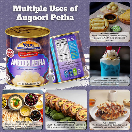 Product Type: SweetsPackaging: CanNet Wt. 35.3oz (2.2lbs) 1kg, Pack of 2Product of India Ingredients: Sugar Syrup, Ash Gourd Natural Preservatives...