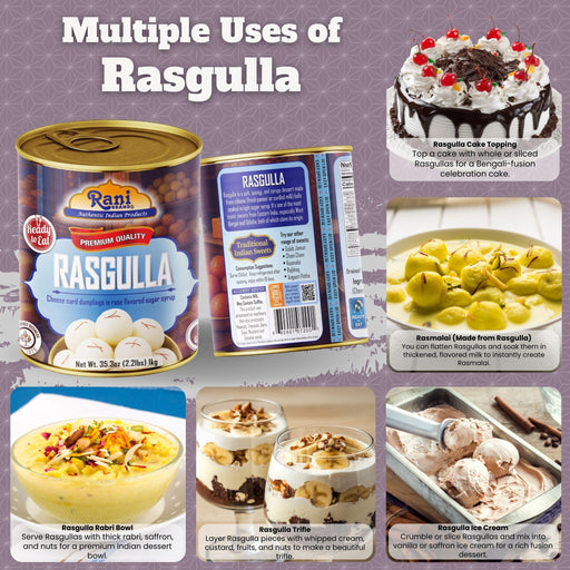 Product Type: SweetsPackaging: CanNet Wt. 35.3oz (2.2lbs) 1kgProduct of India Ingredients: Sugar Syrup, Concentrated Milk Solids, Cottage, Cheese ...