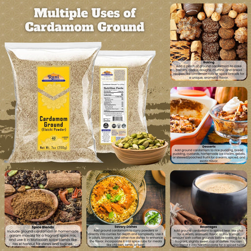 Product Type: Ground PowderPackaging: Plastic BagNet Wt. 7oz (200g)Product of IndiaAlternative Name: Elachi Ingredients: Cardamom Powder (Ground de...