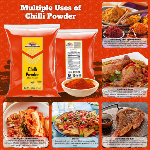 Product Type: Chilli PowderPackaging: Plastic BagNet Wt.: 14oz (400g)Product of India Ingredients: Chilli Ground Powder You'll LOVE our Chilli...