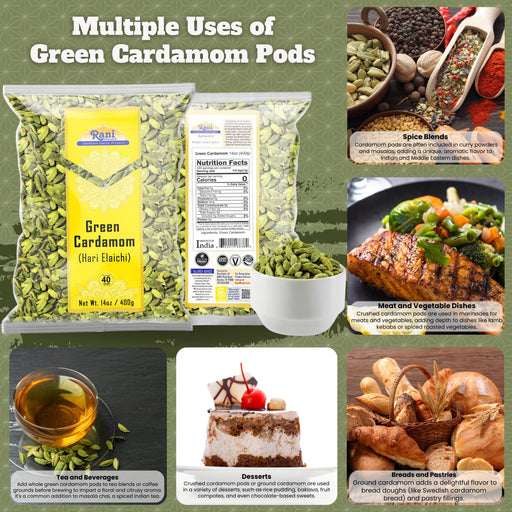 Product Type: Whole Pods, 100% recleanedPackaging: Poly BagNet Wt. 14oz (400g)Product of IndiaAlternative Name (Indian) Hari Elachi Ingredients: ...