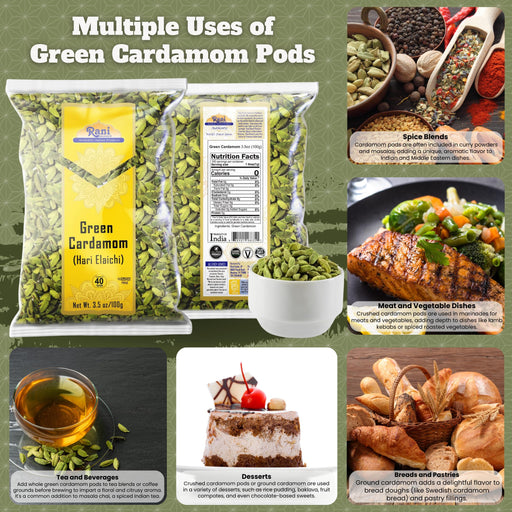 Product Type: Whole Pods, 100% recleanedPackaging: Poly BagNet Wt. 3.5oz (100g)Product of IndiaAlternative Name (Indian) Hari Elachi Ingredients: ...